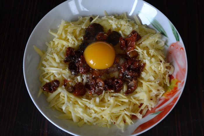 Тем временем для начинки натереть на крупной терке адыгейский сыр, нарезать на небольшие кусочки вяленые помидоры, чеснок пропустить через пресс и добавить яйцо. Перемешать.