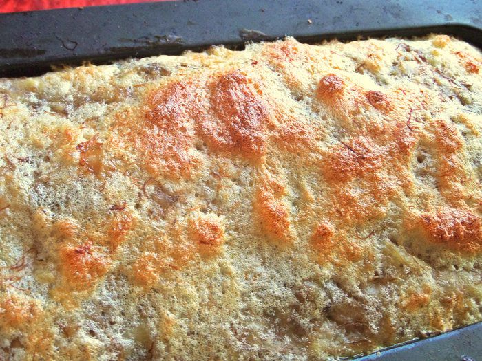Вылить сверху заливку по порциям, чтобы впиталась в хлеб. Не бойтесь наполнять до краев — пирог «не убежит» и сильно не поднимется.