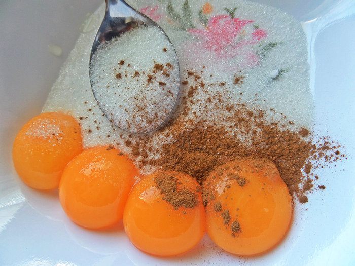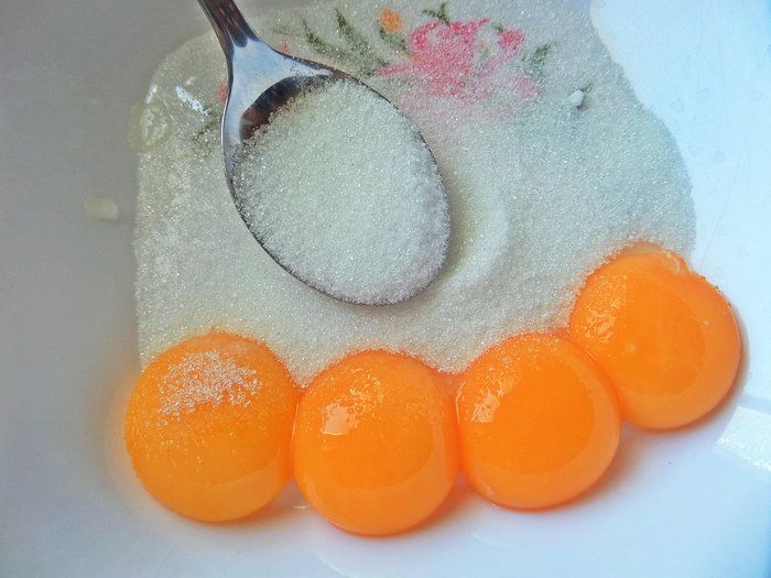 Для заливки нужно отделить белки от желтков. Желтки соединить с сахаром и ванилью.