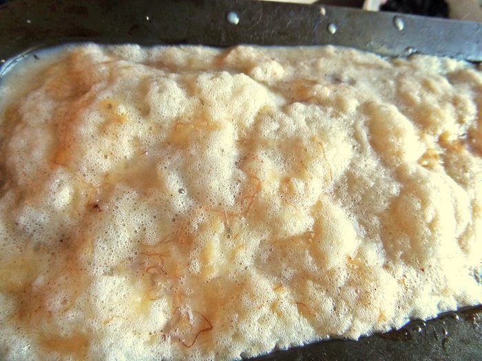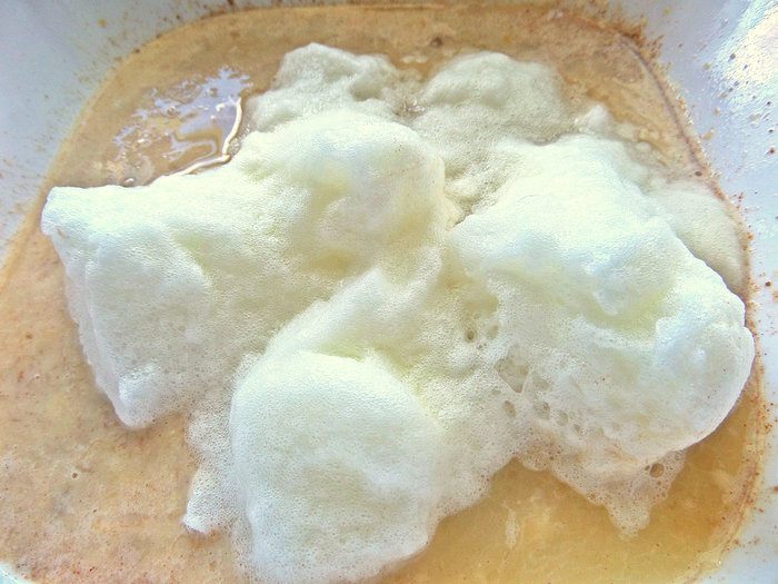 Переносим шапку из белков в желтковую массу. Заливка готова. Налить немного заливки на дно формы.
