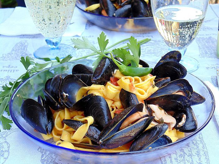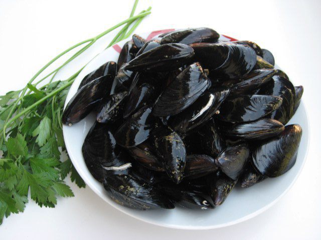 Мидии промыть под проточной водой с щеткой, удалить водоросли, за которые мидии держались в море за камни. Положить мидии в сотейник, влить вино, закрыть крышкой, готовить 10 минут на сильном огне, переодически потряхивая сковороду. Добавить мелко порубленную петрушку.