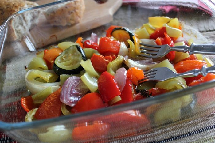 Поместите все овощи в форму, предназначенную для запекания в духовке (стеклянную, керамическую или металлическую). Слегка посолите и перемешайте их между собой. Очищенный зубчик чеснока раздавите широкой стороной ножа и вместе с веточкой свежей зелени поместите вглубь овощей или замените свежий чеснок чесночным маслом Biolio.