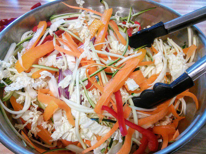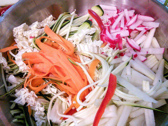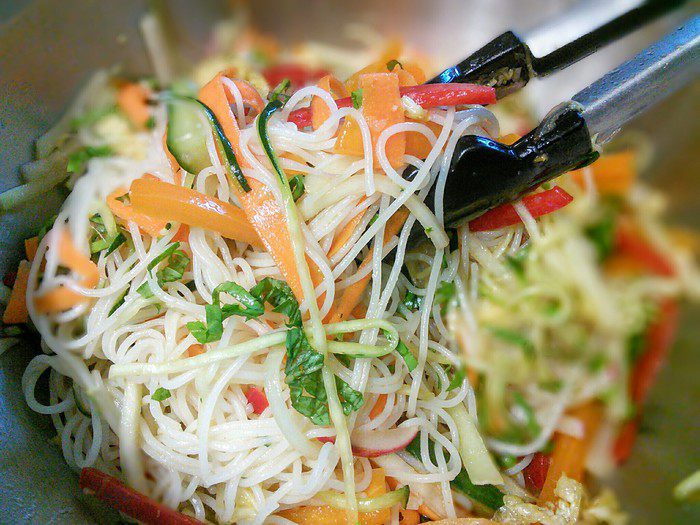 За это время рисовую лапшу приготовить согласно указанию на упаковке. Выложить на дуршлаг и промыть холодной воды, чтобы остановить процесс варки. Соединить с овощами, хорошо перемешать.
