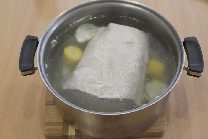Нарежьте лук и морковь. Овощи вместе с мясом положите в кастрюлю с кипящей водой и варите 20 — 25 минут.