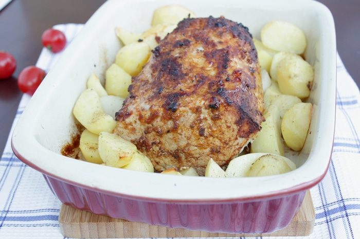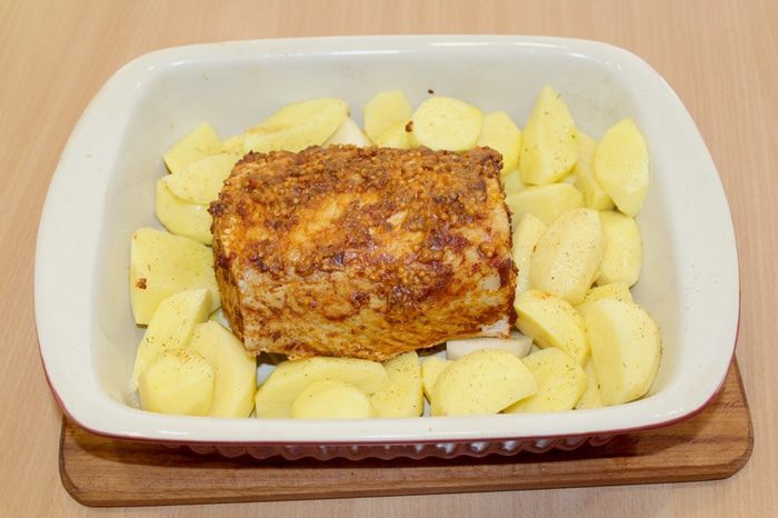 Достаньте мясо ,обмажьте его аджикой. Нарежьте ломтиками картофель. Положите окорок и картофель в форму для запекания.