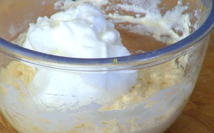 Добавить цедру и сок лимонов, всыпать муку, все перемешать, затем небольшими порциями ввести белки и вымешать.