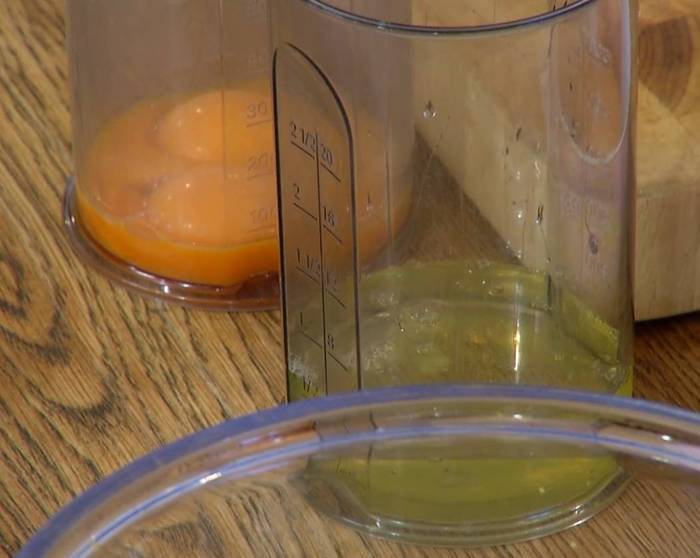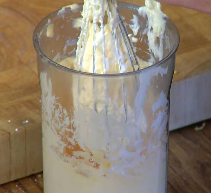 Желтки с сахарной пудрой взбить блендером с насадкой-венчиком в густую пышную массу, затем добавить 180 г предварительно размягченного сливочного масла и на более низкой скорости взбить все до однородного состояния.