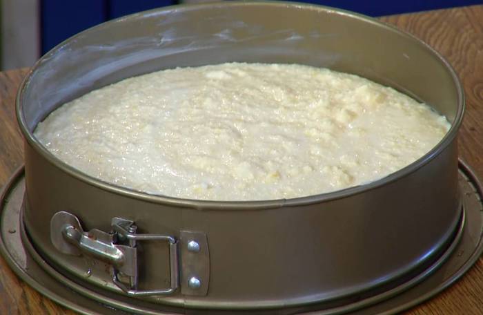 Разъемную форму для выпечки смазать оставшимся сливочным маслом и вылить тесто.