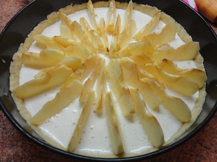 Яблоки выставить вертикально по кругу в форму с тестом и залить яичной смесью.