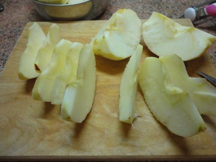 Включить духовку для разогрева до 180°С. Яблоки очистить от кожицы и сердцевины и нарезать тонкими дольками.