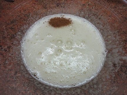 Подготовить заливку. Яйца с сахаром взбить, добавить корицу и сливки и еще раз взбить.