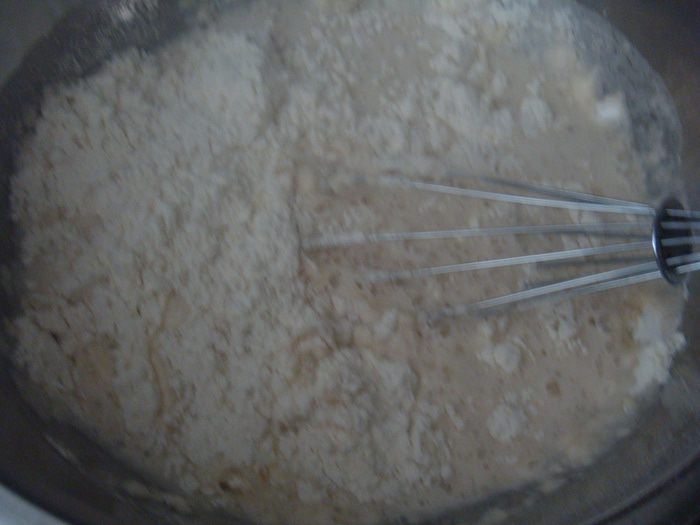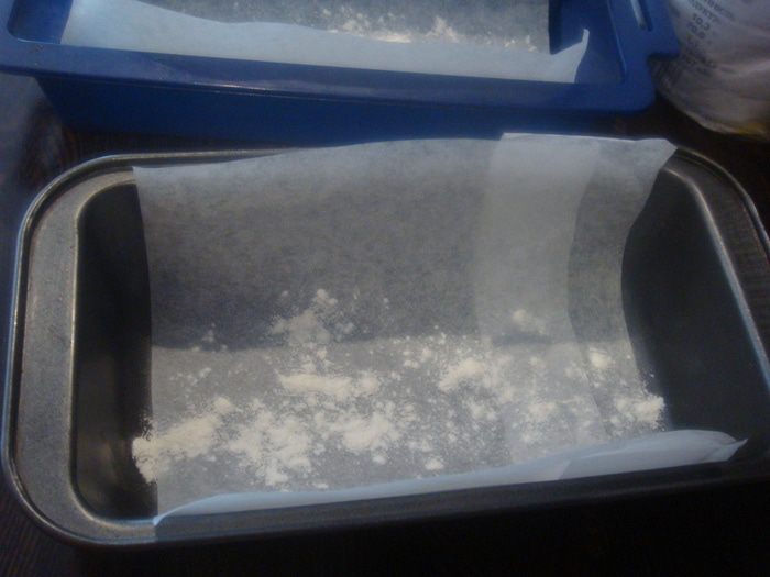 Форму застилаем бумагой для выпечки и присыпаем мукой (если у вас есть большая узкая форма, то тесто можно не делить на две части, у меня две маленькие формы для кекса).