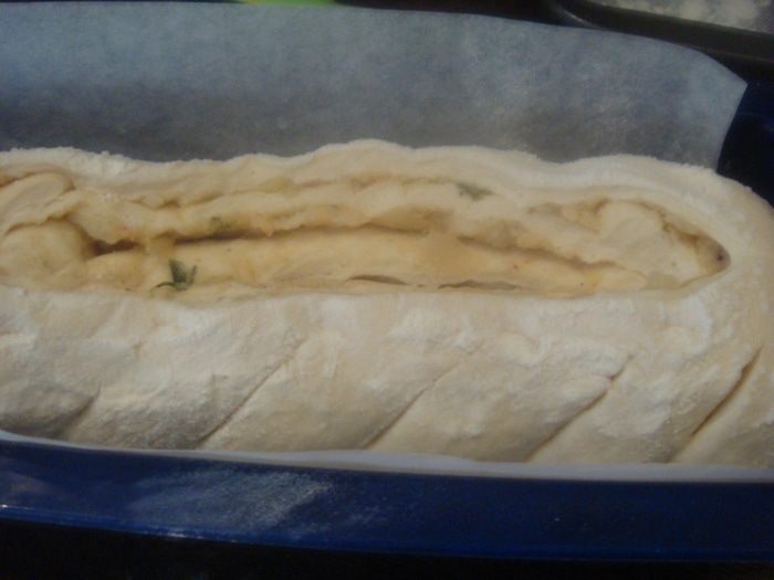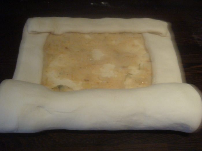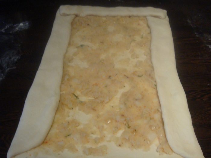 Тесто раскатываем в прямоугольник, намазываем картофельным пюре. Заворачиваем края теста с трех сторон (как на фото).