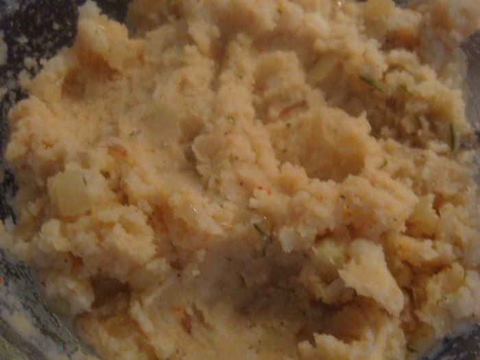 Картофель отвариваем, делаем пюре. Лук прожарим на растительном масле, добавим в картофельное пюре. Чеснок пропустим через чеснокодавилку (пюре делаем на свой вкус, я добавляла паприку).