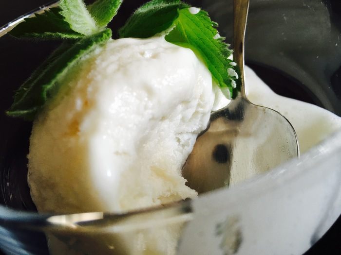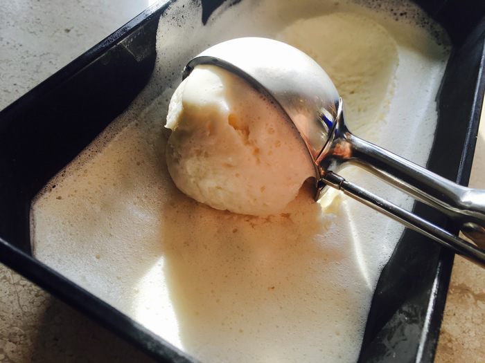Смесь получается как густая сметана. Перекладываем ее в форму и ставим в морозильную камеру на пару часов. Все! Мороженое готово!