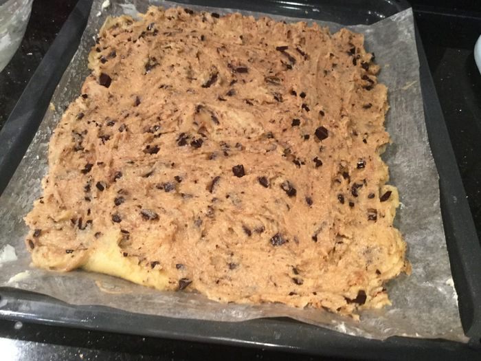 Противень застелите бумагой для выпечки, смажьте маслом. Выложите тесто на подготовленный противень, разровняйте и выпекайте в духовке около 20 минут.