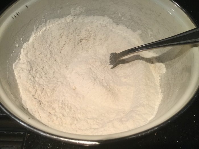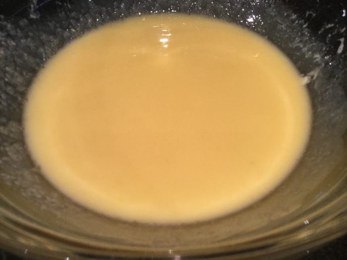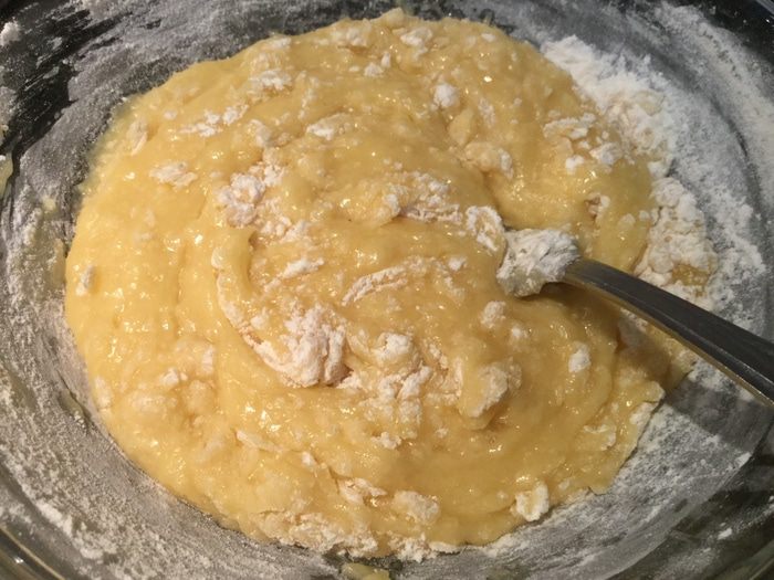 В жидкую часть теста медленно добавляйте мучную смесь, все время помешивая.
