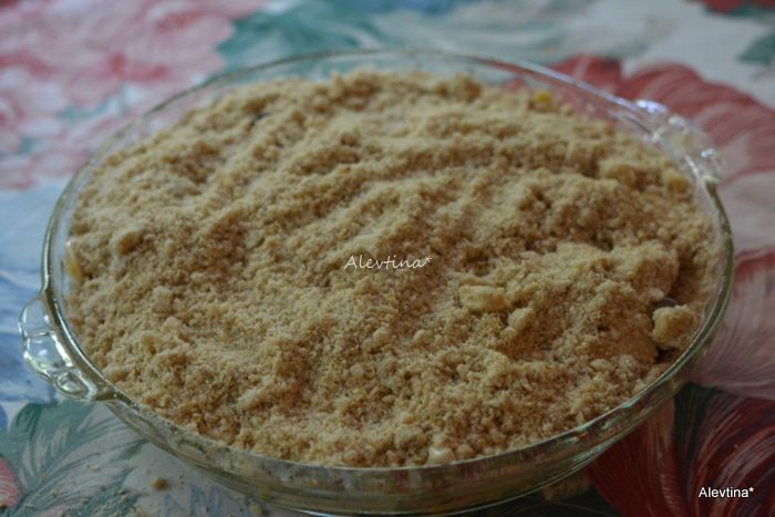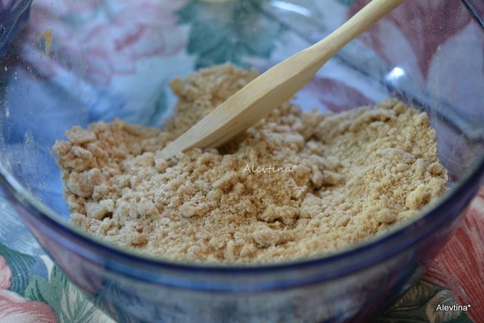 Получится крупная крошка. Добавить 1/4 стакана кефира и перемешать слегка, чтобы оставалось комковатое тесто. Отставить в сторону.