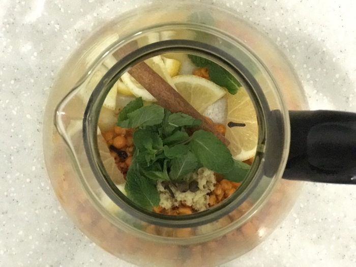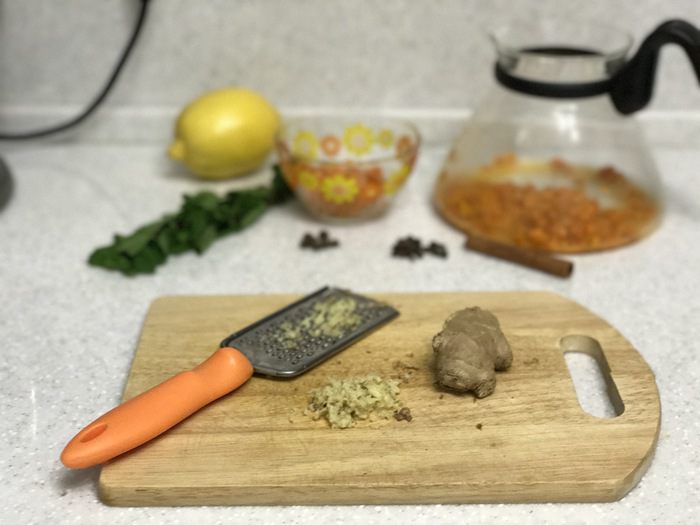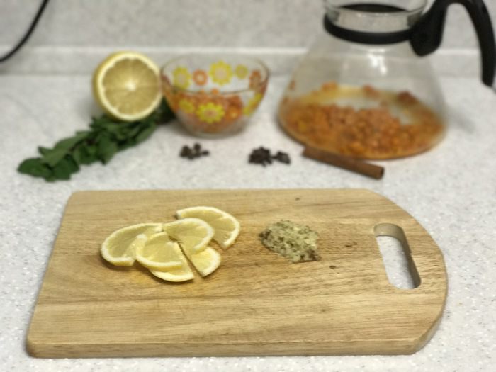 Добавить в чайник имбирь и лимон.
