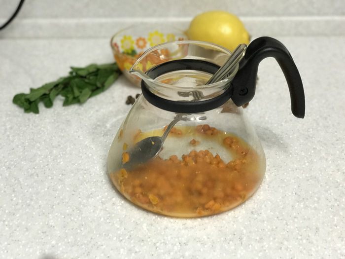 В чайник высыпаем облепиху и мнем ее столовой ложкой или предварительно в удобной для вас емкости.