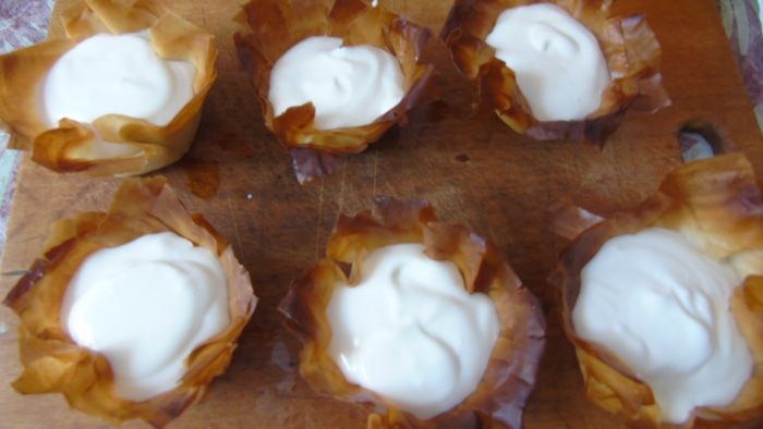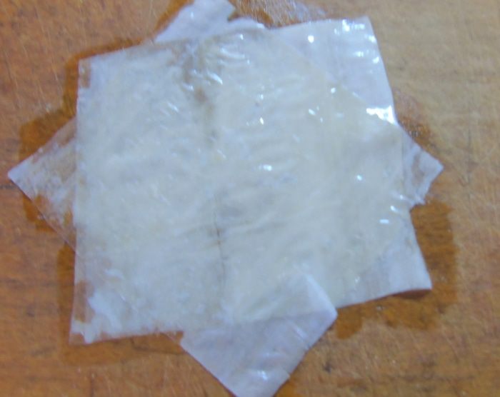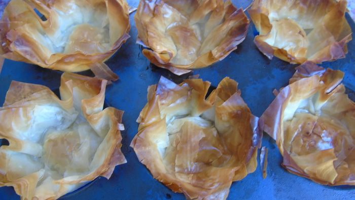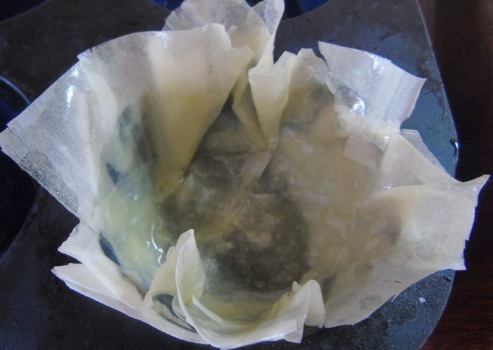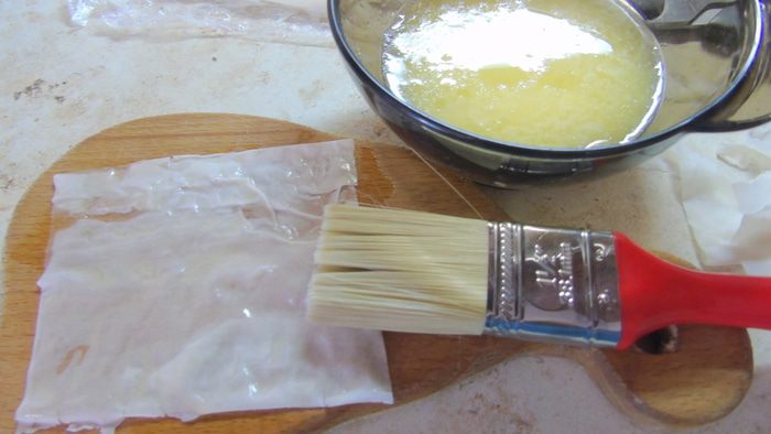 Сливочное масло растапливаем в пиале. Тесто фило нарезаем квадратами и смазываем маслом.