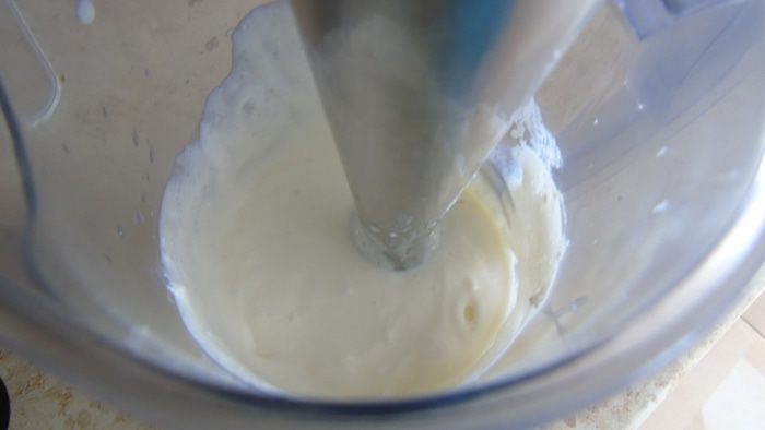 Творог с сахарной пудрой взбиваем блендером, а если у вас йогурт, то просто смешиваем с сахарной пудрой по вкусу.