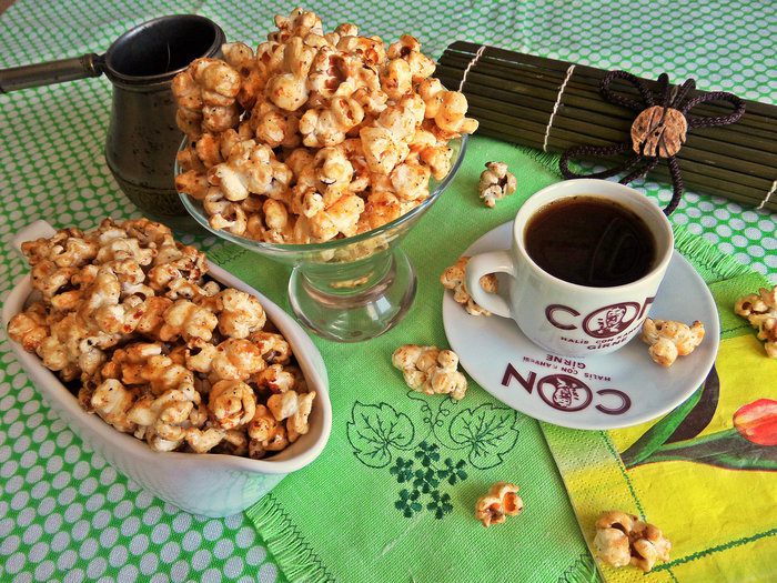 Варим карамель до характерного карамельного цвета и легкой густоты. Выключаем и тут же поливаем струйкой весь попкорн.