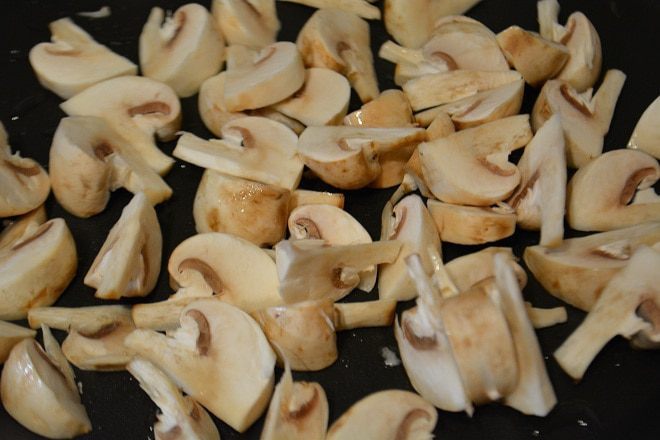 Грибы также помыть, обсушить и нарезать на ломтики. Обжарить до золотистого цвета на сковороде с добавлением оливкового масла.