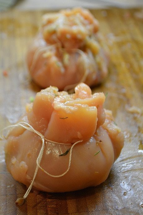 Собрать края на верх и завязать кулинарной ниткой или скрепить зубочисткой. Уложить в форму, смазанную маслом.