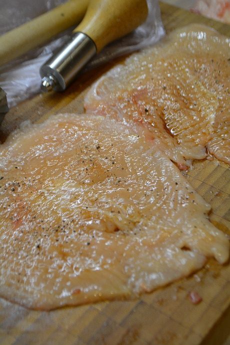 Куриную грудку помыть и обсушить бумажным полотенцем. Разрезать вдоль на 2 части. Накрыть целлофановым пакетом и хорошо отбить с двух сторон. Каждую отбивную смазать ст. л соевого соуса, поперчить и оставить на некоторое время.