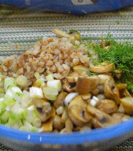 В чашке смешать заранее отварную гречневую крупу, зеленый лук и укроп измельченный, грибы. Все хорошо перемешать. Немного посолить и поперчить.