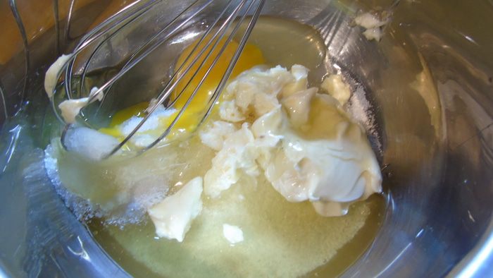 Смешать в посудине сахар, яйцо, соль, мед и мягкое сливочное масло.