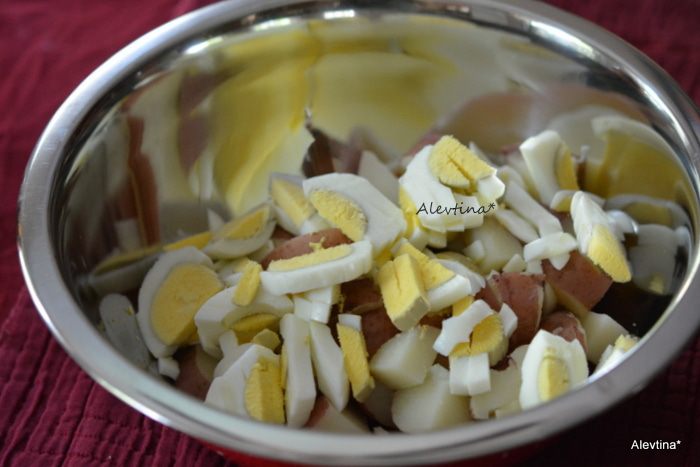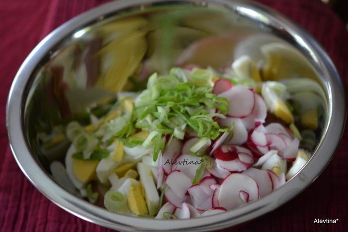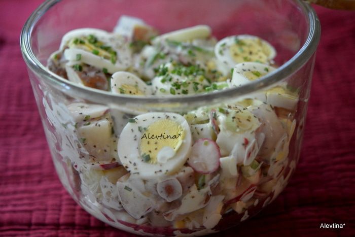 Картофель и редис, вареное яйцо приятный союз. Отличный салат для выезда на пикник.