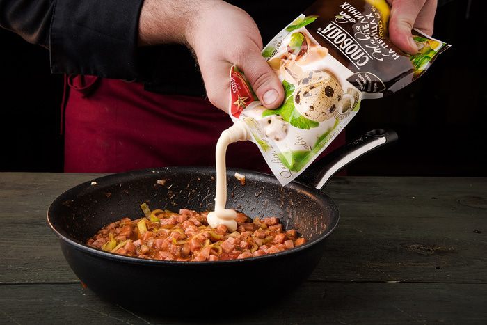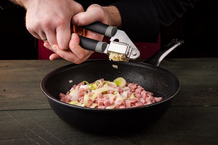Для начинки: ветчину мелко нарезать, лук порей нарезать кольцами, зубчик чеснока натереть на мелкой терке или раздавить прессом. Обжарить все вместе в сотейнике 4 — 5 минут.