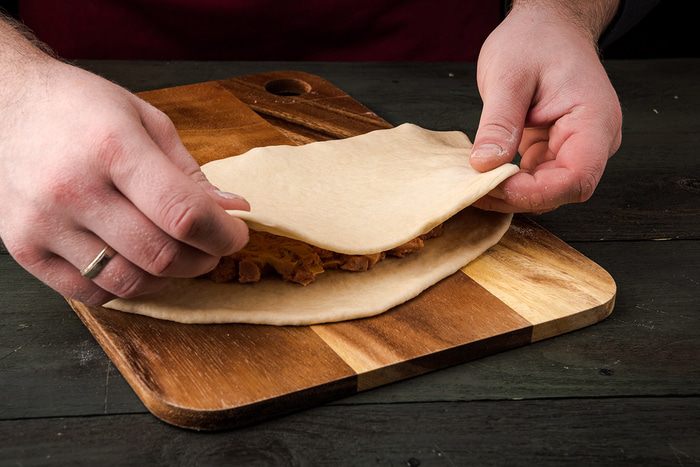 На половину круга кладем начинку. Накрываем начинку второй половиной теста и защипываем при помощи вилки.