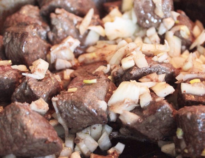 Растопить в сотейнике сливочное масло и обжарить говяжий гуляш. Добавить к нему мелко порубленные лук и чеснок и жарить, помешивая, еще около 5 минут.