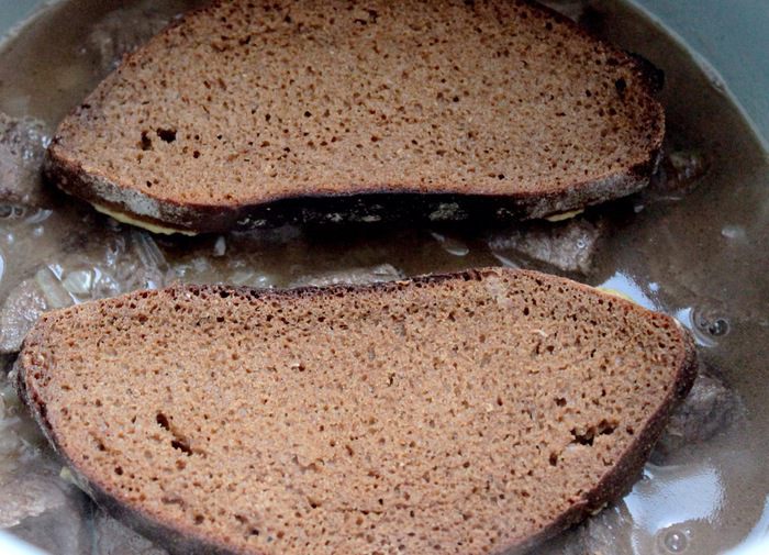 Добавить к говядине ½ литра воды (бульона) и пиво, довести до кипения и варить примерно 5 минут. Приправить мясо перцем, солью, сахаром.