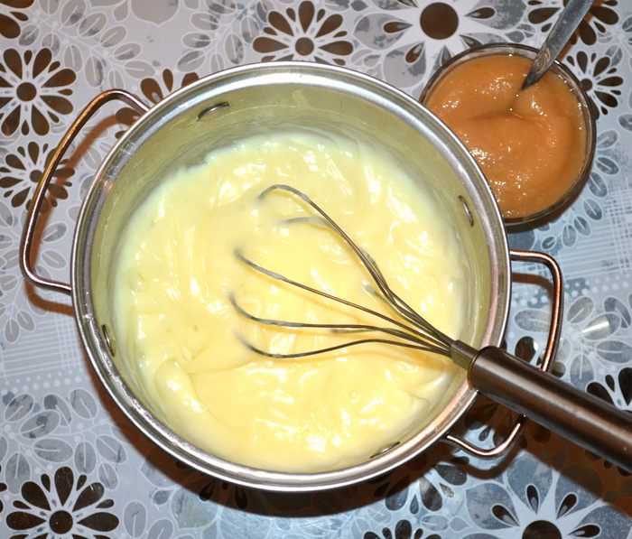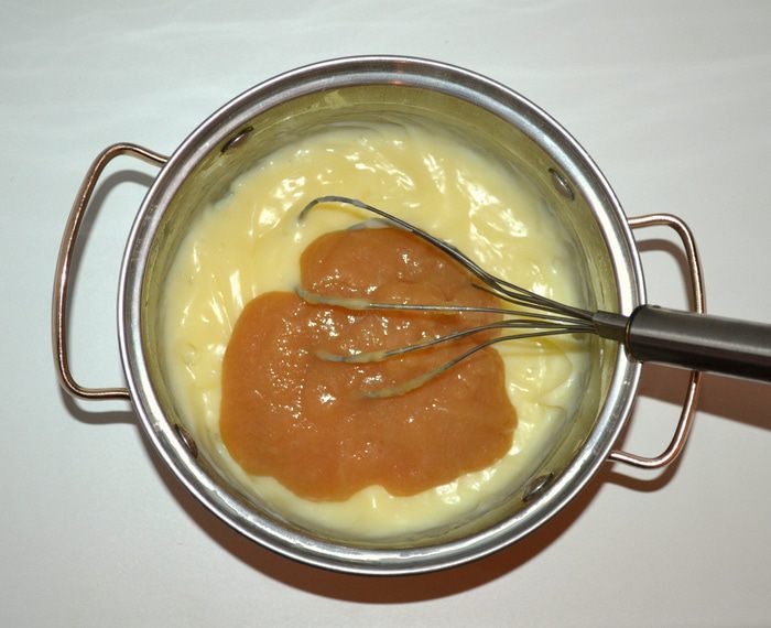 1 большое яблоко испечь, пюрировать. Можно использовать готовое яблочное пюре.
