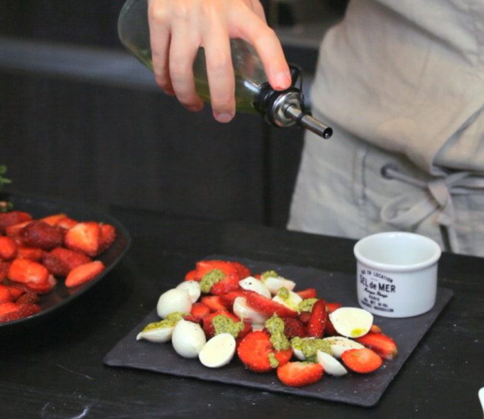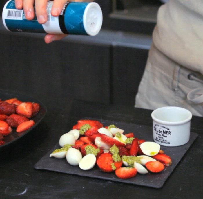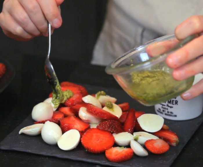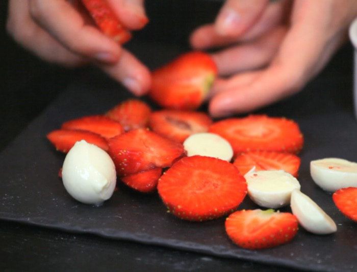 Нарезать клубнику и моцареллу, выложить на блюдо.