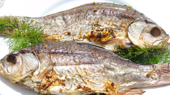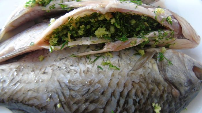 Рыбку солим по вкусу и начиняем, оставляем на 20-30 минут. Или складываем в контейнер и отправляемся на пикник :) Изначально у меня было три карася, но пока она мариновалась, мой кот забрал свою порцию и оставил только две, хорошо что хоть что-то оставил :)
