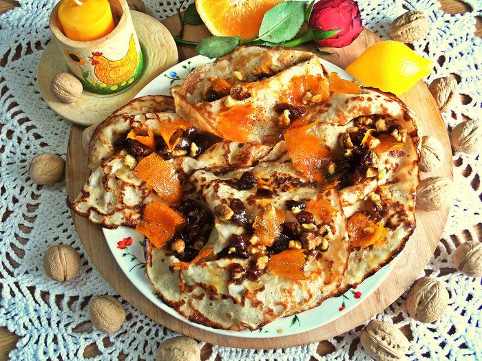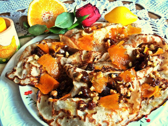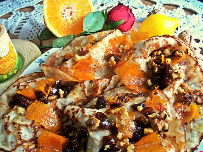 Хочу поздравить всех с Днем Победы и угостить вот такими праздничными блинчиками! Поливаем их вкуснейшим соусом,идею которого подсмотрела у Ю.Высоцкой (заменила только лимоны на апельсин).
