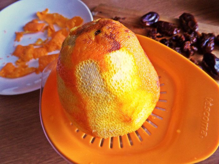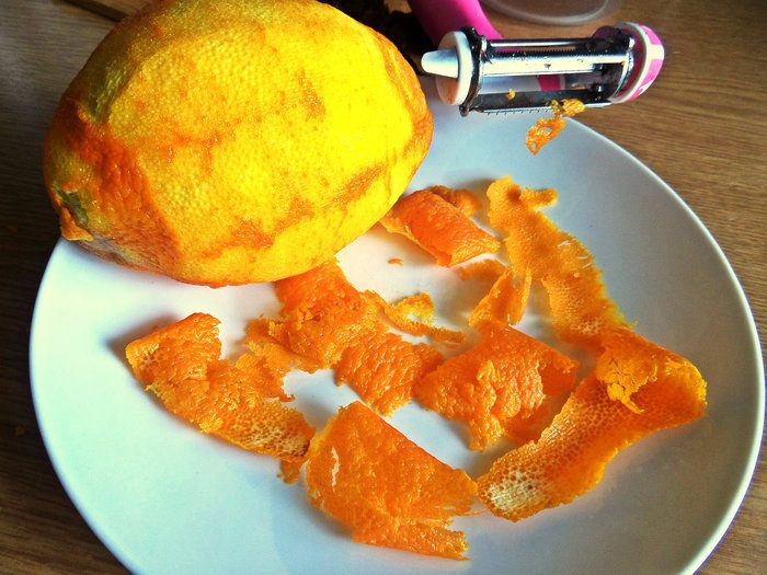 Для соуса с чистого апельсина снимаем кожицу слайсами.