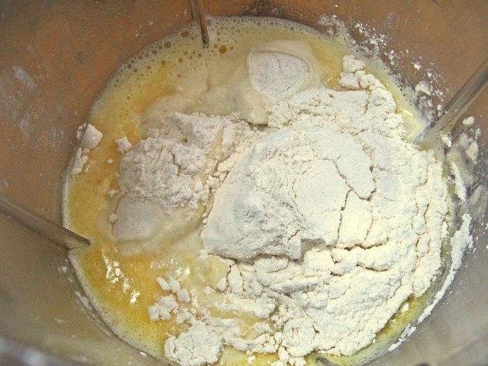 Высыпаем просеянную муку с разрыхлителем, взбиваем.
