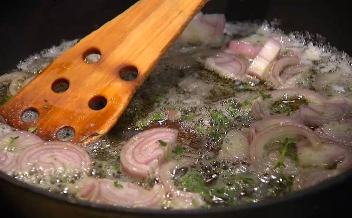 Растопить в тяжелой сковороде 70 г сливочного масла, выложить лук, посыпать его листьями тимьяна, перемешать и обжарить до золотистого цвета.