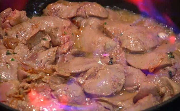 Выложить к луку печень и обжарить с одной стороны, затем перевернуть, добавить коньяк и мед, перемешать и обжарить печень до готовности.