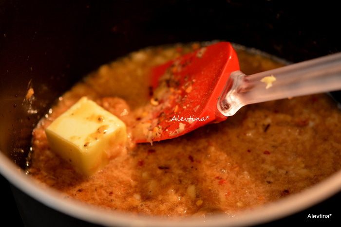 Поставить на медленный огонь, добавить сливочное масло, куриный бульон. Перемешивать. Довести до кипения и снять с огня. Дать остыть.