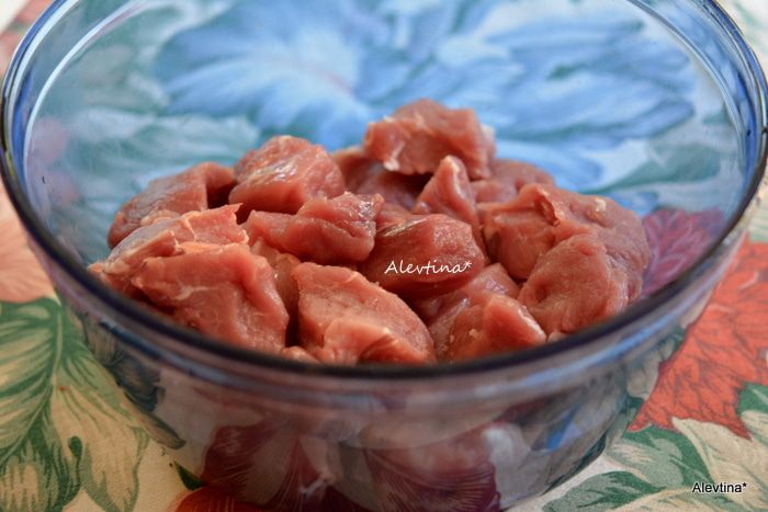 Свинина вырезка не жирная нарезать кубиками.