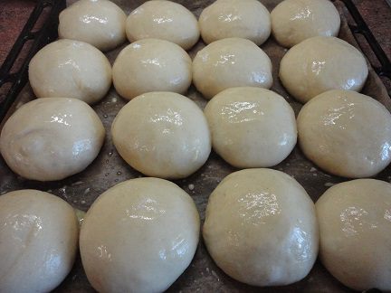 Выкладываем на противень, выстланный бумагой. Даем расстояться. Время расстойки зависит от температуры воздуха в помещении. Смазываем оставшимся желтком, смешанным с молоком.