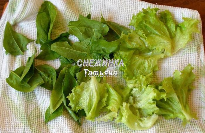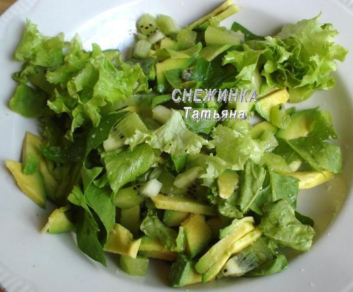 Шпинат и листья салата рвем руками на небольшие кусочки. Соединяем с киви, авокадо.