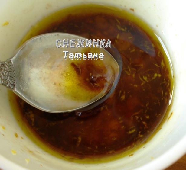 Готовим заправку. Натираем цедру половинки лимона, добавляем оливковое масло, бальзамический уксус, мед, все перемешиваем.